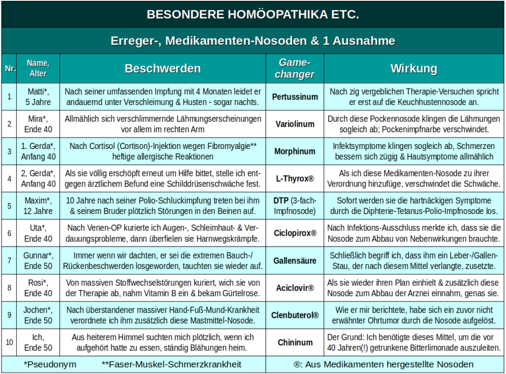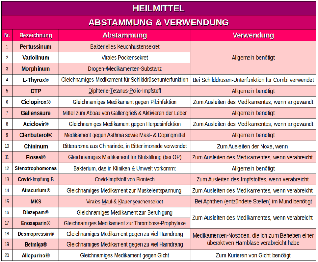 Nun gebe ich Ihnen einen Überblick über einen Großteil der Arzneien, deren Wirkung mir im Laufe von ca. 15 Jahren innerhalb meiner in der Regel umfangreichen Verordnung besonders aufgefallen ist: