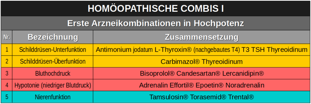 Bei Monika jedoch reichte es nicht aus, ihr zusätzlich zu den übrigen benötigten Homöopathika L-Thyroxin® zu verabreichen. In der Hoffnung damit ihre Heilblockade beheben zu können, fügte ich die Arznei mit weiteren dazu passenden hoch potenzierten Homöopathika zu einer Combi zusammen. Siehe dazu die nächste Übersicht! Zu meiner Erleichterung wurde sie dadurch tatsächlich ihren täglichen Leistungseinbruch los.