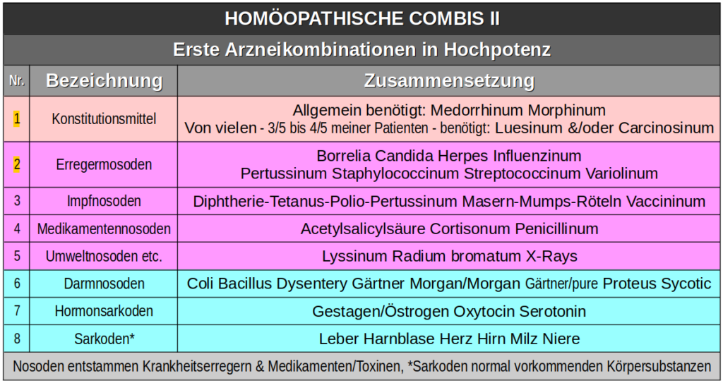 Durch Behandlung meiner Patienten gelangte ich zu der Erkenntnis, dass sie umfangreicher mit Erregern und auch Toxinen belastet waren, als es zunächst den Anschein erweckte. Da ich ihnen fast alle in meiner 2. Übersicht aufgeführten und sogar weiter aufgestockten Arzneien verordnet habe, fügte ich diese zu meiner Multi Combi zusammen. Diese große Combi ist bislang sogar Neugeborenen bekommen. Dazu habe ich bei jedem Patienten noch die individuell benötigten Homöopathika hinzugefügt.