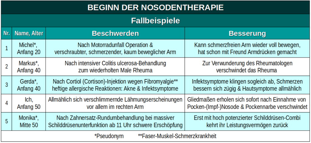 In der nun folgenden Übersicht können Sie 5 Fallbeispielen entnehmen, warum mich die Wirkung der angewandten Nosoden in Erstaunen versetzte: