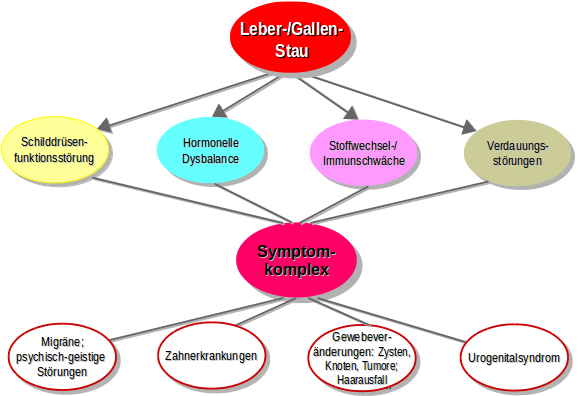 Als 2019 das Thema Covid aufkam, nahm ich an, dass, wie ich es zuvor bei meinen Patienten und mir selbst erlebt hatte, kein einzelner Faktor allein hinter den Symptomen steckte, sondern ein vielfältiges Krankheitsgeschehen, dessen Hauptursache in einer überlasteten Leber bestand. Mit der nun folgenden Graphik möchte ich Ihnen skizzieren, welch umfangreiche Folgen sich mitunter zuspitzen können (*Fallbeispiele siehe unten), wenn unser Hauptstoffwechselorgan durch Gallengrieß zu verstopfen und ein Leber- und Gallenstau sich zu entwickeln beginnt:
