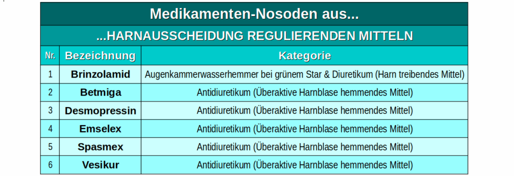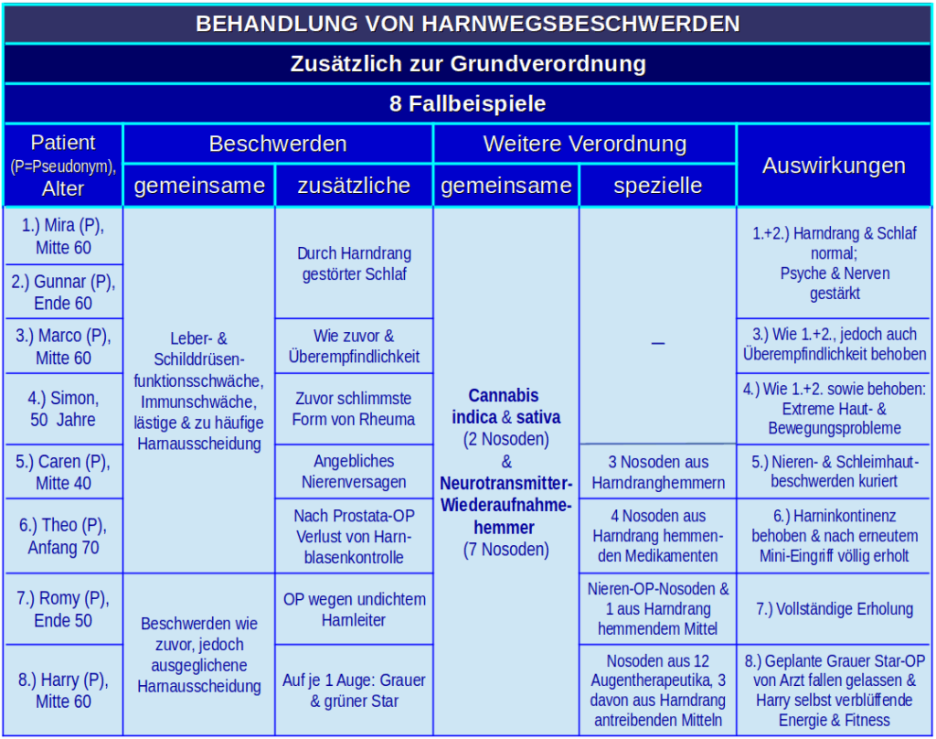 In der Hälfte der 8 aufgelisteten Fälle (5. – 8. Fall) erforderten die bestehenden Beschwerden weitere Arzneien – insbesondere die folgenden aus ursprünglichen Harnausscheidung regulierenden Therapeutika gewonnene Nosoden: